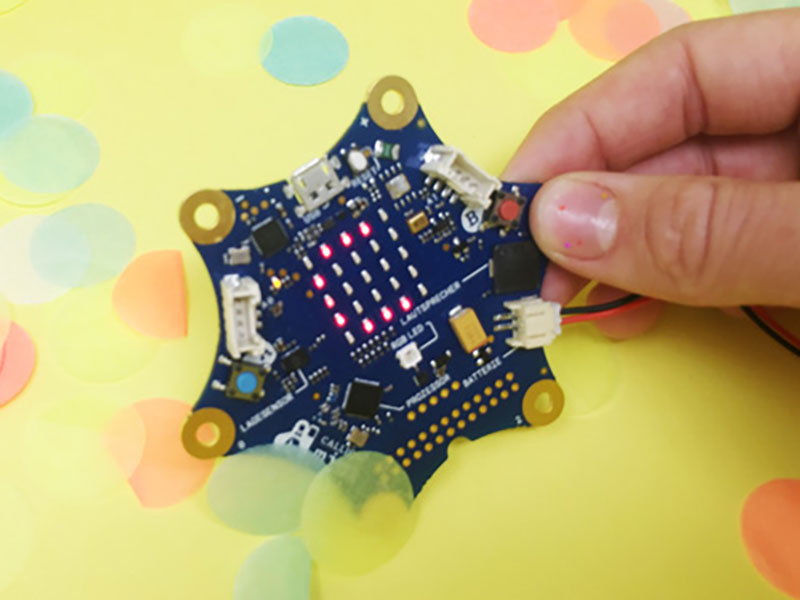 | 端子の短絡を防ぐユニークな外見。25個のLEDと2個のボタンスイッチのほか、加速度センサーと磁力センサー、無線通信機能を備えるのはもちろん、RGB-LEDやスピーカー&マイクロフォン、そして。2つのDCモーターコントローラーを内蔵し、追加で用意する機材を削減します。さらに、Grove、GPIOなどのコネクターにより拡張性も備えています。 |