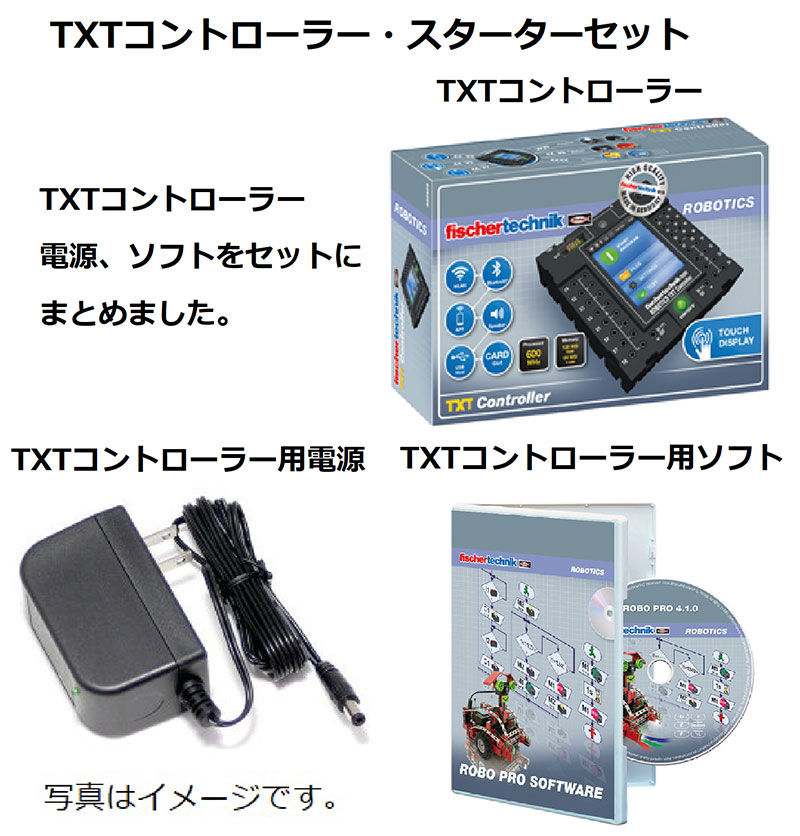 フィッシャーテクニックの旗艦CPUであるTXTコントローラーに必要なアイテム(ソフト、電源)をセットにしたスターターキットをアレンジしました。