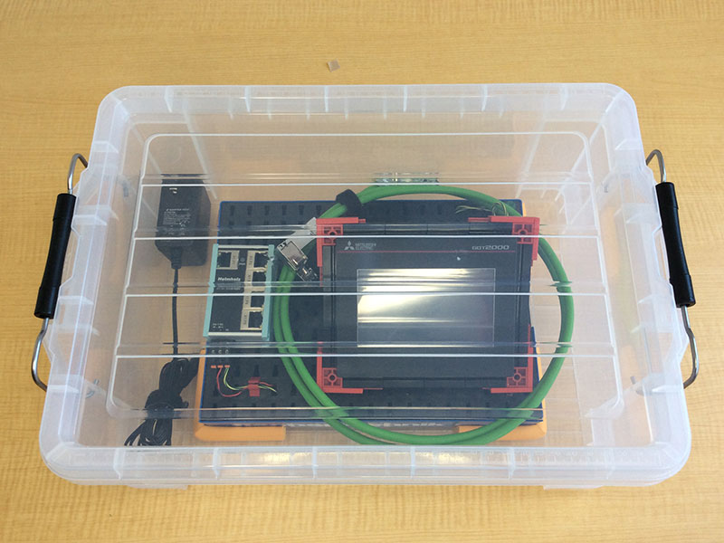 フィッシャーテクニックのトレーニングモデルを活用したPLCプログラミング学習を効率よく進めるために、PLCやHMIをコンポーネントとして提供いたします。モデルへの接続を考慮した電気配線。授業等での運用を考慮した収納BOXの付属。