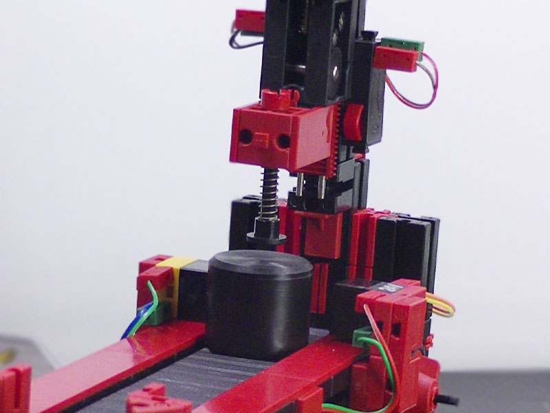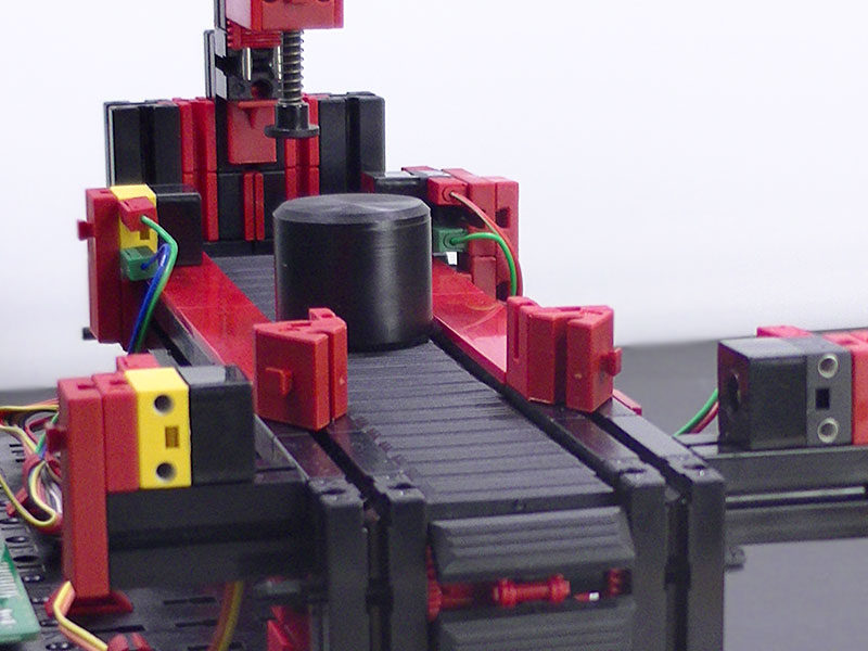 コンベアーの奥に、プレス機を備えた加工機です。シンプルなモデルでPLCを初めて勉強するのに最適なモデルです。