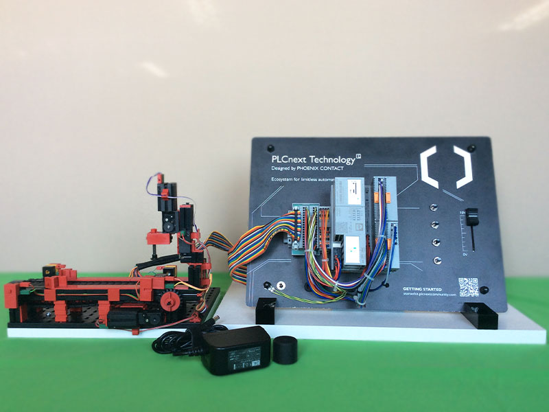 Punching Machine with Conbeyorに、フエニックスコンタクト製PLCをセットにしました。PLCラックには、PLCnextがfischertechnik_PCBコンポーネンツを介して、モデルと配線されています。また、スイッチ4つ、ランプ4つを備え、初歩的なプログラムから、モデルを活用した、自動制御までを体験できます。PLCには、サンプルプログラムが既に書き込まれており、モデルの一連の動作をすぐに試せます。プログラミングに係るソフトウェア、パソコン、ケーブル等は、別途ご用意ください。
